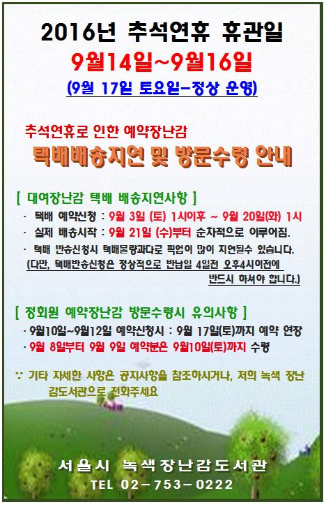 | 제목 | 2016년 추석연휴로인한 예약장난감 택배배송지연및 방문수령안내 |