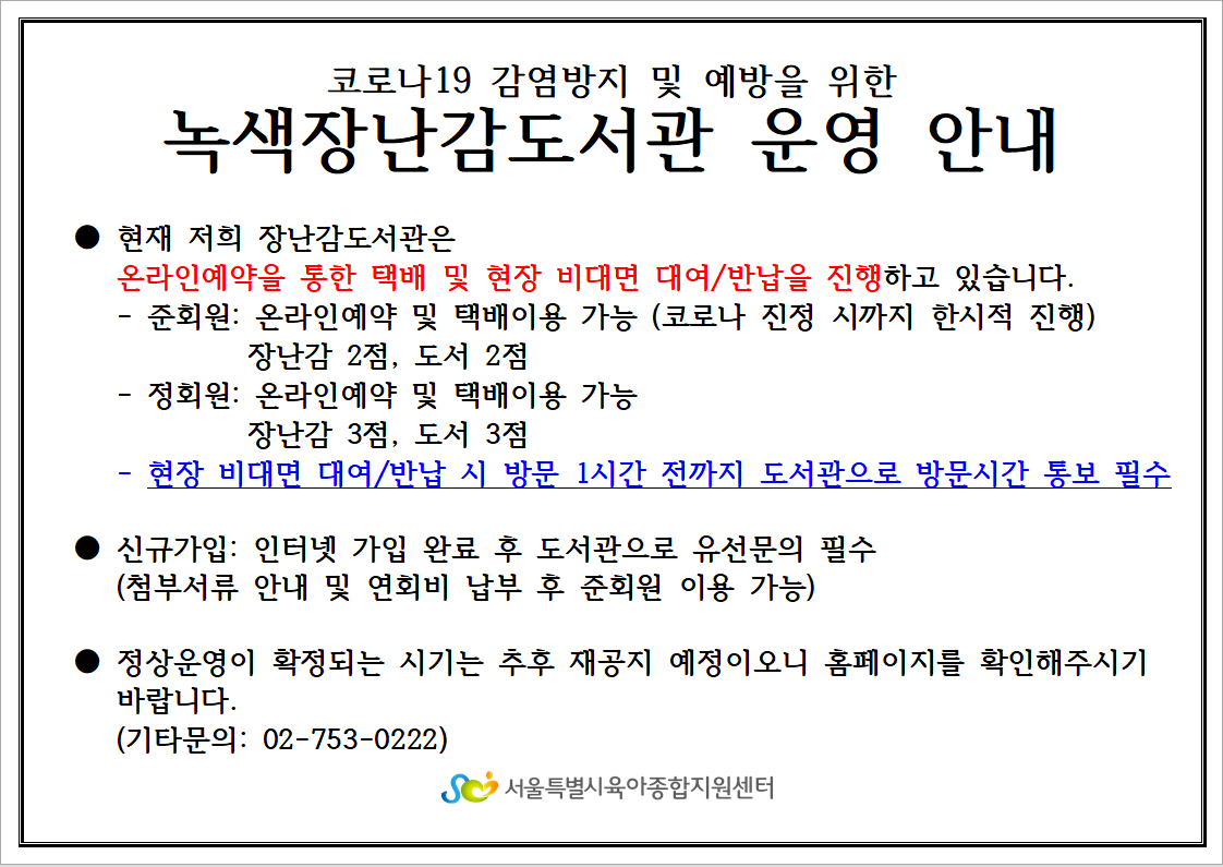 | 제목 | **코로나19로 인한 녹색장난감도서관 운영안내** |