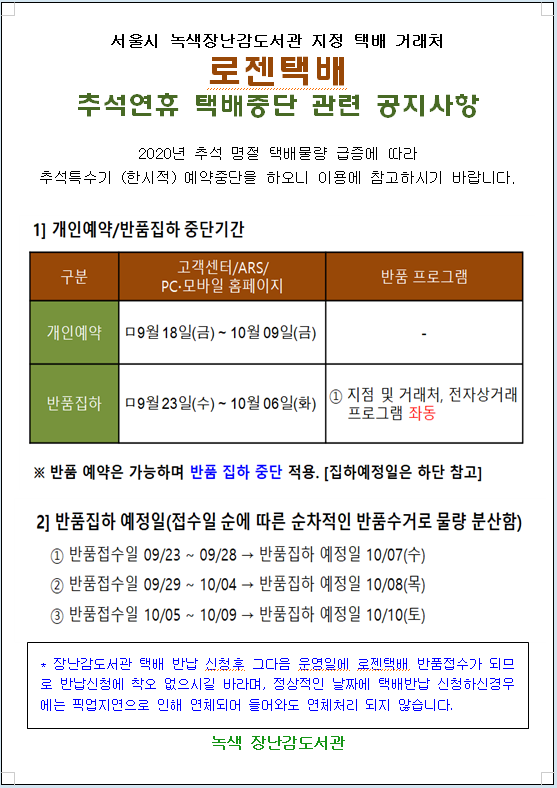 | 제목 | 2020년 추석연휴로 인한 택배 발송 및 픽업중단안내 [로젠택배공고] |