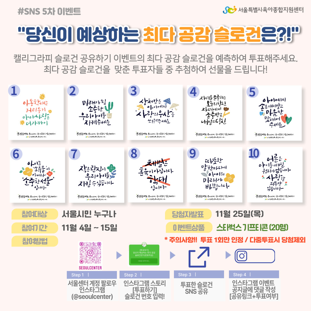 SNS 5차 이벤트는 '당신이 예상하는 최다 공감 슬로건은?!' 입니다. 10개의 캘리그라피 슬로건 중 최다 공감 슬로건을 예측하여 투표해주세요! 최다 공감 슬로건을 맞춘 투표자들 중 추첨하여 선물을 드립니다!