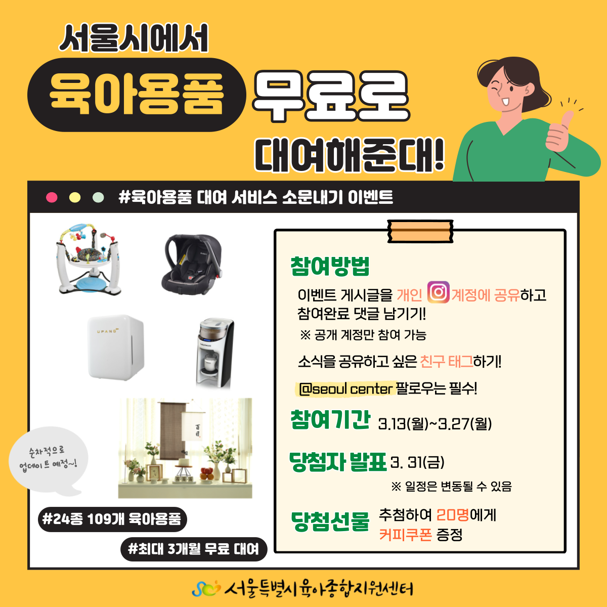 육아용품 대여 서비스 소문내기 이벤트가 진행 중입니다. 많은 참여 바랍니다. 이벤트 바로가기>>https://www.instagram.com/p/CptgjI-vSlu/?utm_source=ig_web_copy_link |