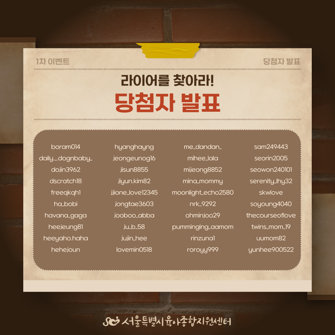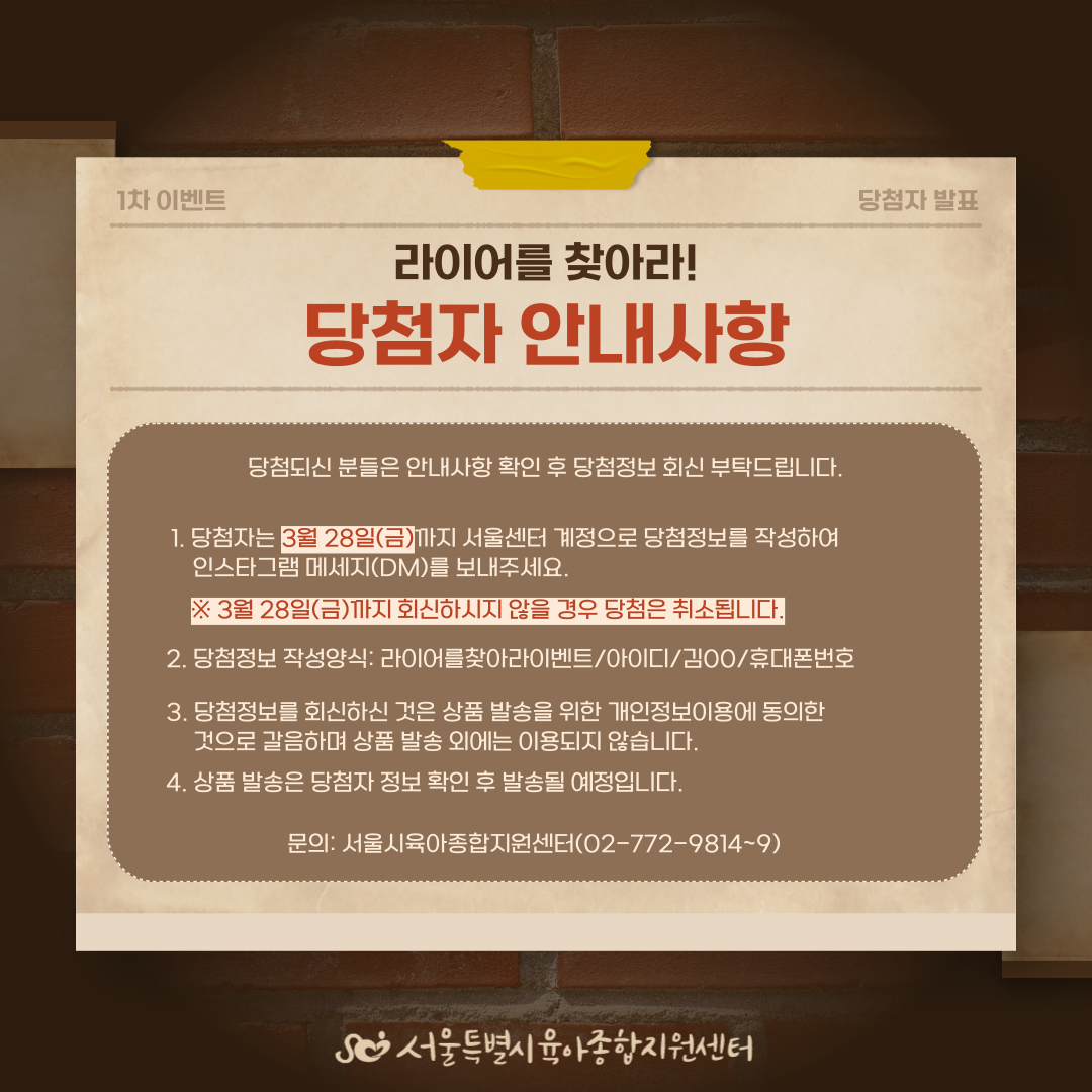 안녕하세요, 서울시육아종합지원센터입니다. 라이어를 찾아라! 이벤트 당첨자를 발표합니다. 이벤트에 참여해주신 분들께 감사드립니다. 당첨되신 분들은 두번째 장의 안내사항을 꼭 확인 후 3월 28일(금)까지 당첨자 정보를 메세지로 전송해주세요. ※3월 28일(금)까지 당첨자 정보 미회신 시 당첨은 취소됩니다. 감사합니다. |