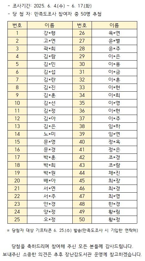 | 제목 | [장난감도서관] 2025년 상반기 이용 만족도조사 참여 당첨자 발표 |