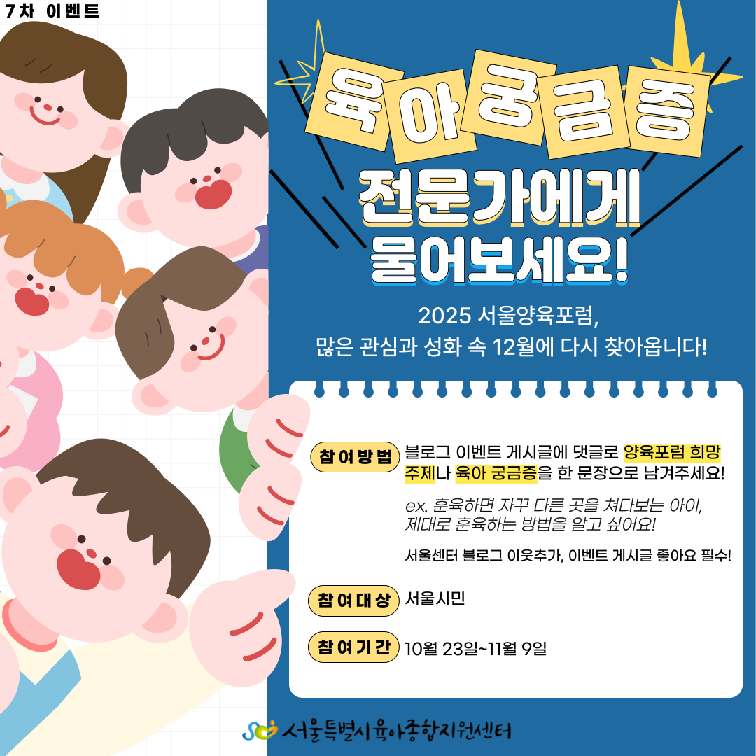 | 제목 | [서울센터] 육아 궁금증 전문가에게 물어보세요! 이벤트(~11/9까지) |