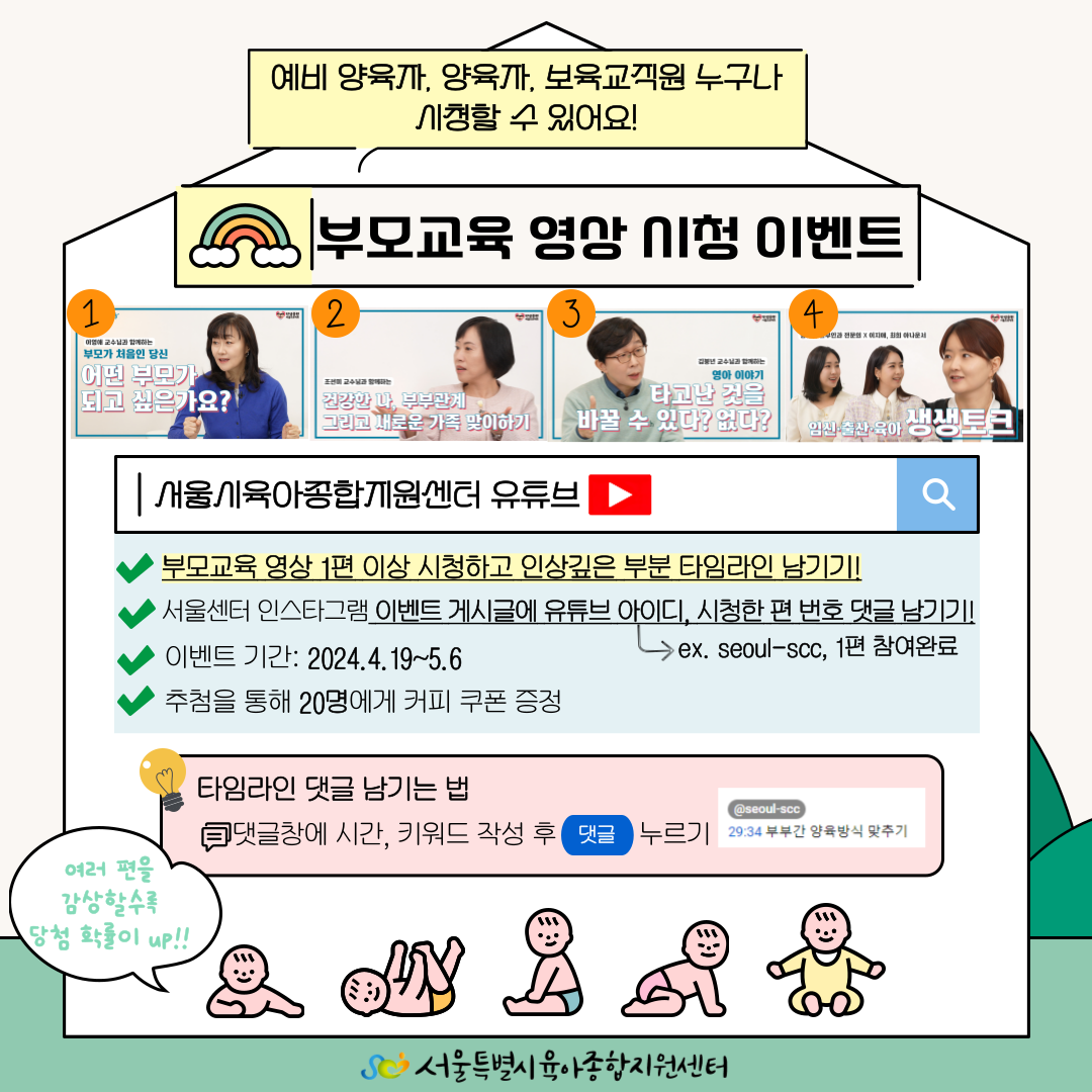서울시와 서울시육아종합지원센터가 부모교육 영상을 제작했다는 사실을 알고 계셨나요? 예비 부모, 부모, 보육교직원 모두에게 도움되는 영상! 시청하고 타임라인 남기면 선물도 드려요~ ✔️서울시육아종합지원센터 유튜브에서 부모교육 영상 1편 이상 시청하고 인상깊은 부분 타임라인 남기기! (여러 편을 감상할 수록 당첨 확률이 올라간대요!) ✔️서울센터 인스타그램 이벤트 게시글에 유튜브 아이디, 시청한 편 번호 댓글 남기기! ✔️이벤트 기간: 2024.4.19~5.6 ✔️예비 부모, 부모, 보육교직원 누구나 참여 가능! 추첨을 통해 20명에게 커피 쿠폰을 드립니다! 많은 관심과 참여 부탁드립니다. 부모교육 영상 보러가기 https://youtube.com/playlist?list=PLi6FpU4Hf6vzoYq-NAjRqJmBne3KNdSQJ&si=sHOBNX1lznMiLgy8 타임라인 댓글 남겼다면? 인스타 댓글 달러가기! https://www.instagram.com/p/C57IELRPBx8/?utm_source=ig_web_copy_link&igsh=MzRlODBiNWFlZA== |