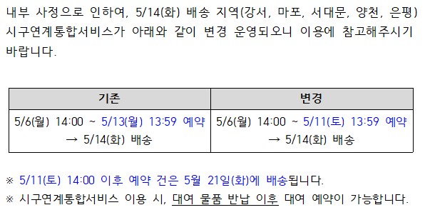 | 제목 | [장난감도서관] 5/14(화) 배송 지역(강서, 마포, 서대문, 양천, 은평) 시구연계통합서비스 배송 변경 안내 |