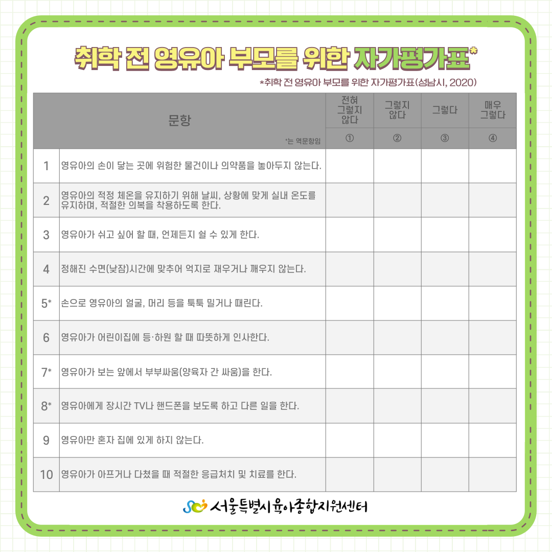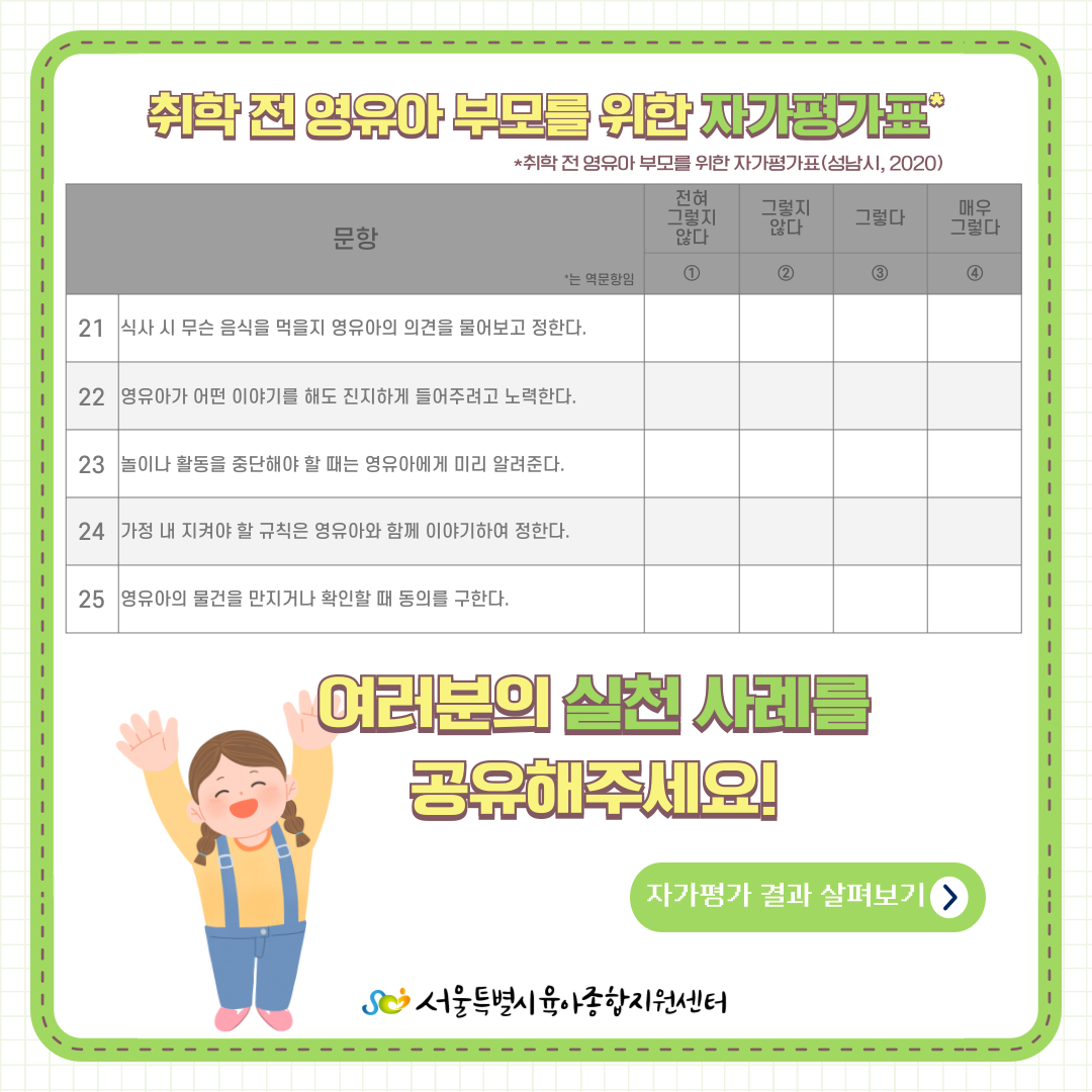 자가평가표 살펴보고, 가정에서 아동 권리를 위해 실천하고 있는 사례를 인스타그램 이벤트 게시글 댓글로 공유해주세요! 서울센터 인스타그램 팔로우, 게시글 좋아요 필수! 추첨을 통해 20명에게 음료 기프티콘을 드려요! 서울시 영유아 자녀를 둔 부모님이라면 누구나! 참여 가능하니 많은 관심과 참여 부탁드립니다. 이벤트 참여 바로가기>> https://www.instagram.com/p/C9wPtuUvLFx/?utm_source=ig_web_copy_link&igsh=MzRlODBiNWFlZA== |