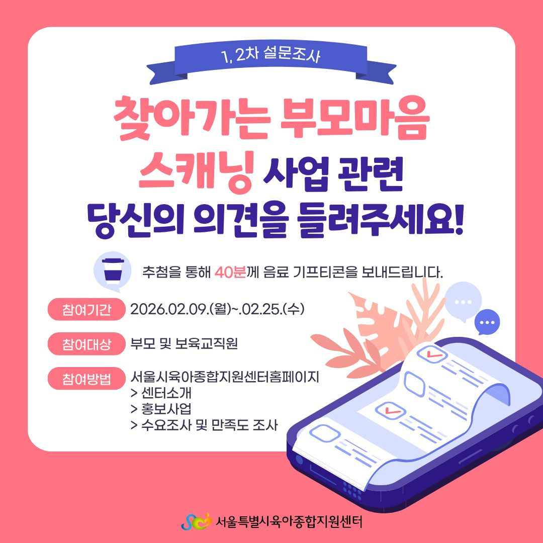 안녕하세요, 서울시육아종합지원센터입니다. 2026년, 영유아를 양육하는 부모님의 스트레스와 심리적 부담을 완화하기 위해 「찾아가는 부모마음 스캐닝」 사업을 새롭게 시작합니다. 본격적인 운영에 앞서 양육자분들의 소중한 의견을 듣고 더 나은 서비스를 준비하고자 하오니 잠시만 시간을 내어 참여해 주시면 감사하겠습니다. 참여는 프로필 하단의 링크를 통해 가능하며, 참여해주신 분 중 40분을 추첨하여 음료 기프티콘을 드립니다! |